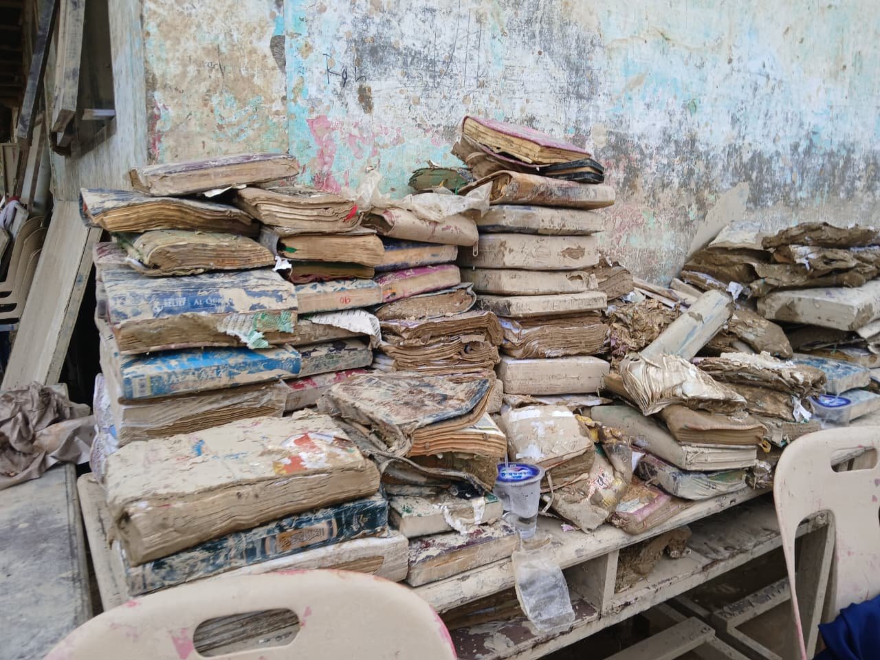 Sebagian mushaf Al-Qur’an rusak, basah, bahkan hilang terbawa banjir.