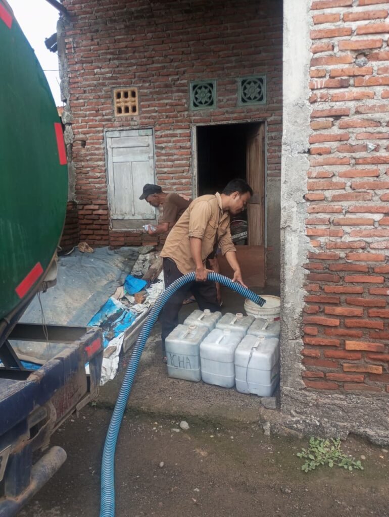Jumlah air yang didistribusikan sebanyak 1 Tangki berisi 8.000 Liter yang disalurkan kepada Mushola Rhoudatul Jannah yang diterima oleh H. Sukrin selaku pengurus Musholla dan Masyarakat Sekitar Musholla sejumlah 60 KK.
